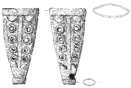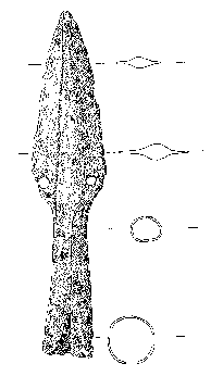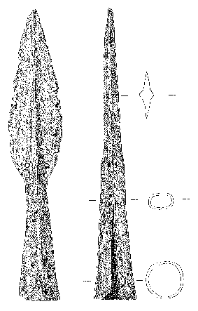Abb. 6: "Thrako-kimmerische" Waffen: Lanzenspitzen, Lanzenscheiden und Dolchbruchstück.1.2.5 aus Kömlöd, 4 aus Ugra und 3 von unbekanntem Fundort.